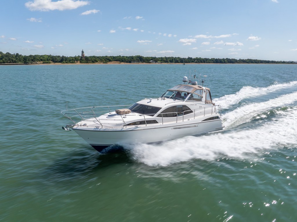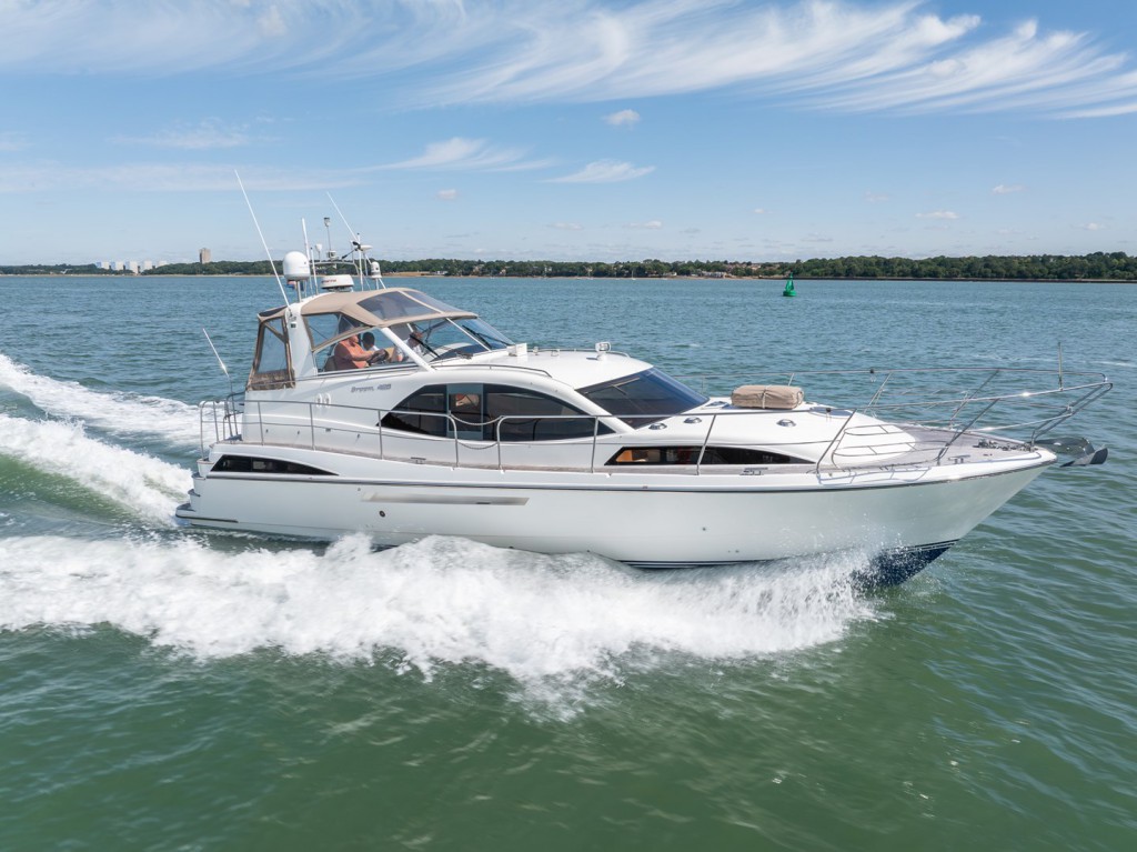 Aangedreven door twee Volvo Penta D6 370 pk motoren, voelt dit exemplaar van de Broom 425 zich evenzeer thuis op open zee als op binnenwateren. Door de inklapbare radarbeugel is de doorvaarthoogte geen probleem. De boot is