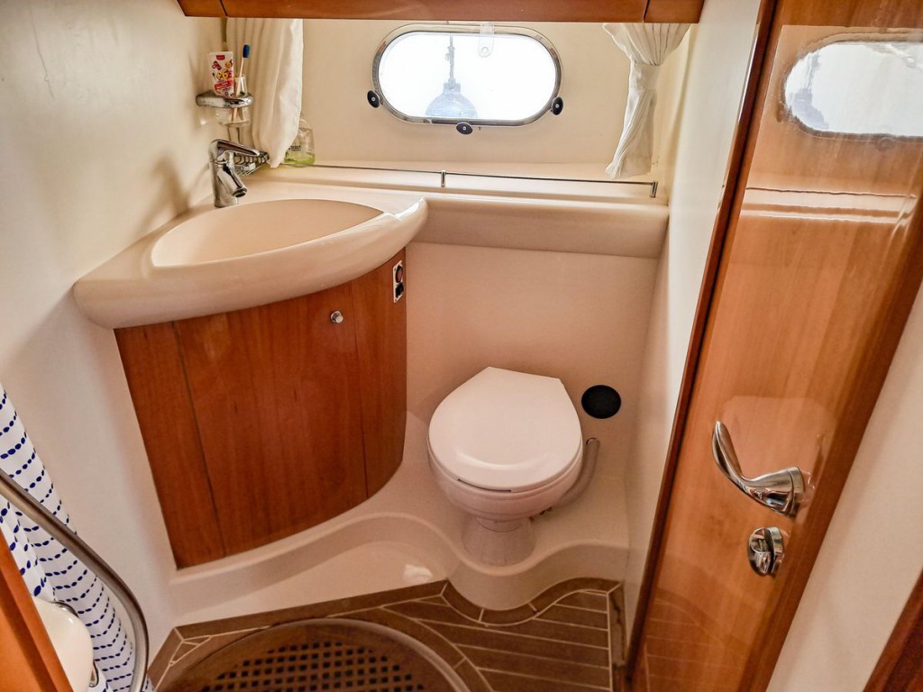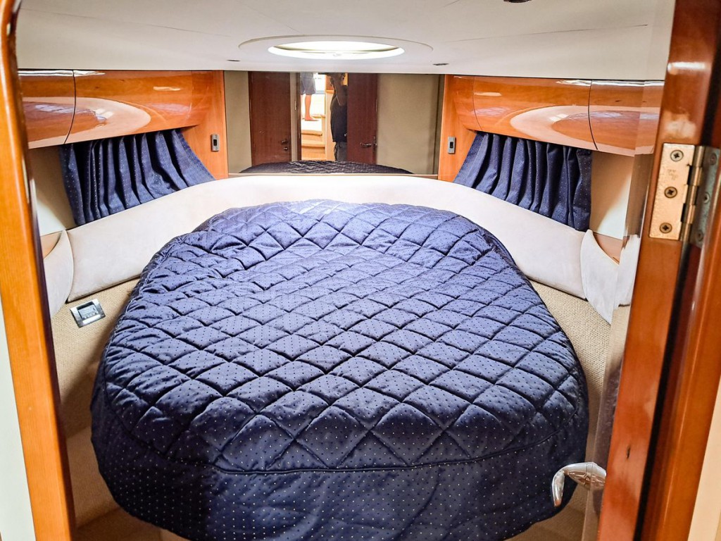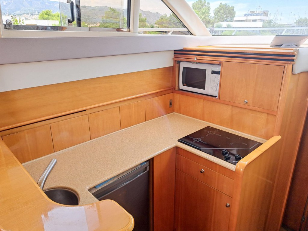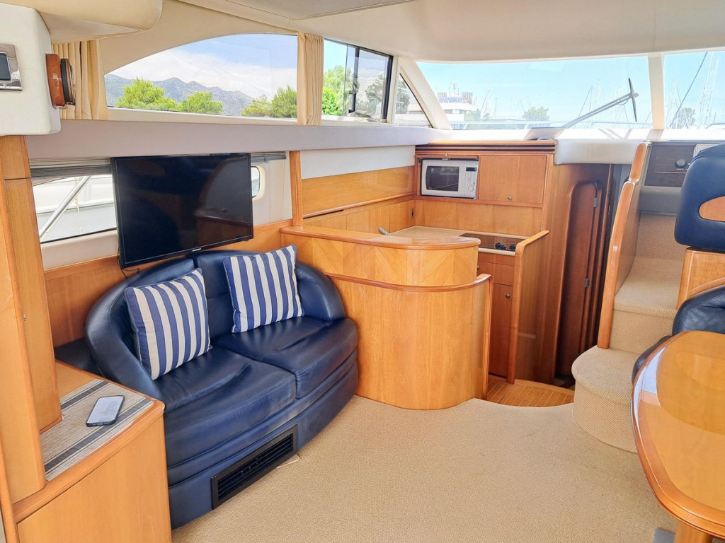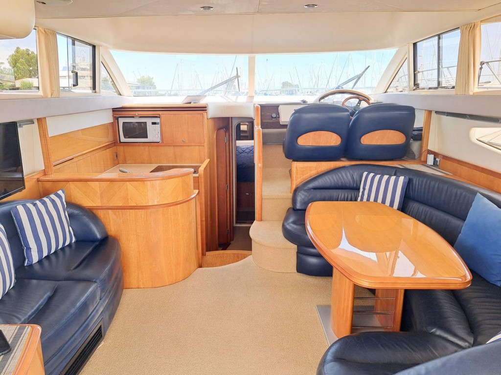 Flybridge met U-vormige zitplaatsen, stuurstation en zonbed